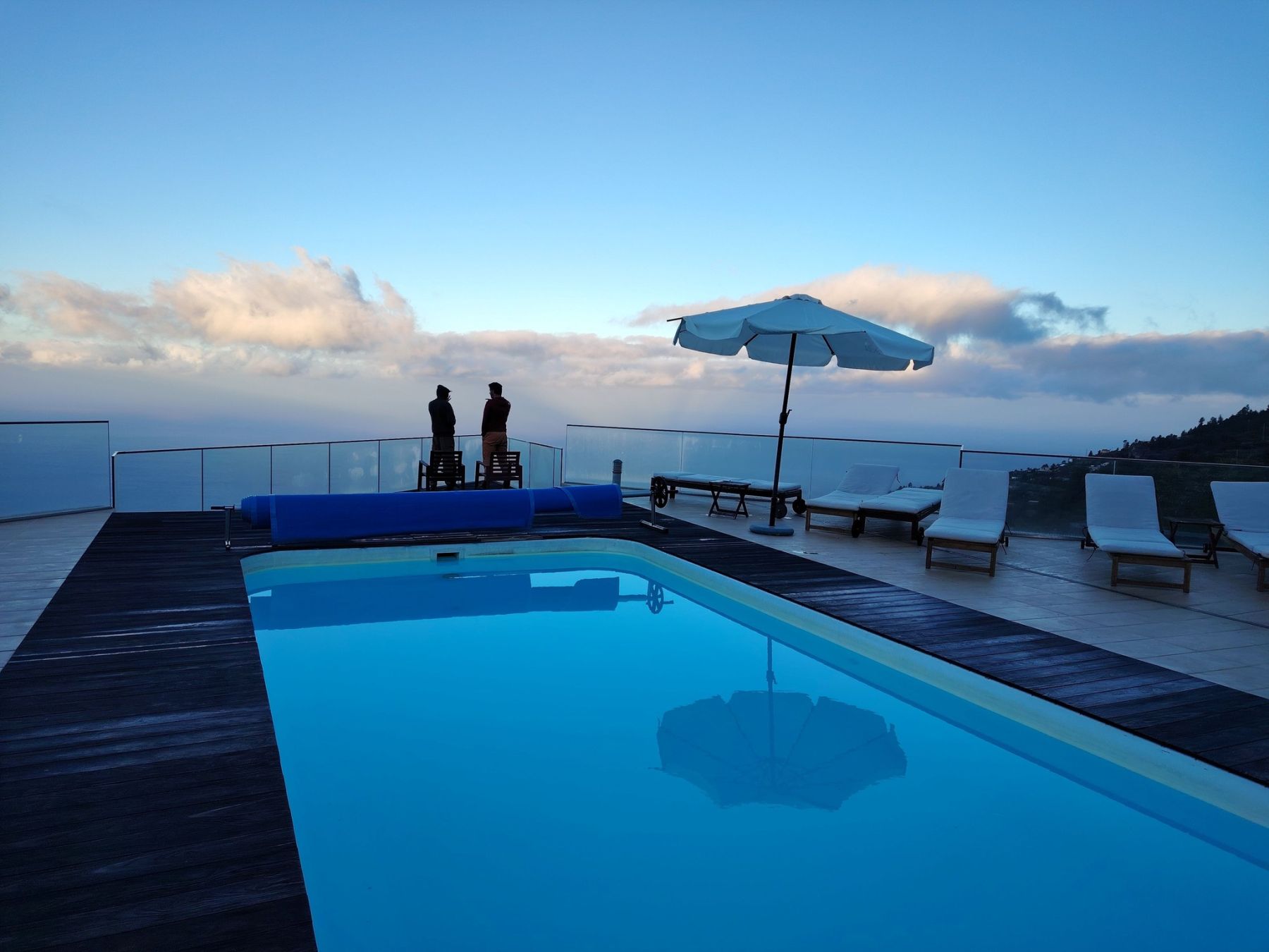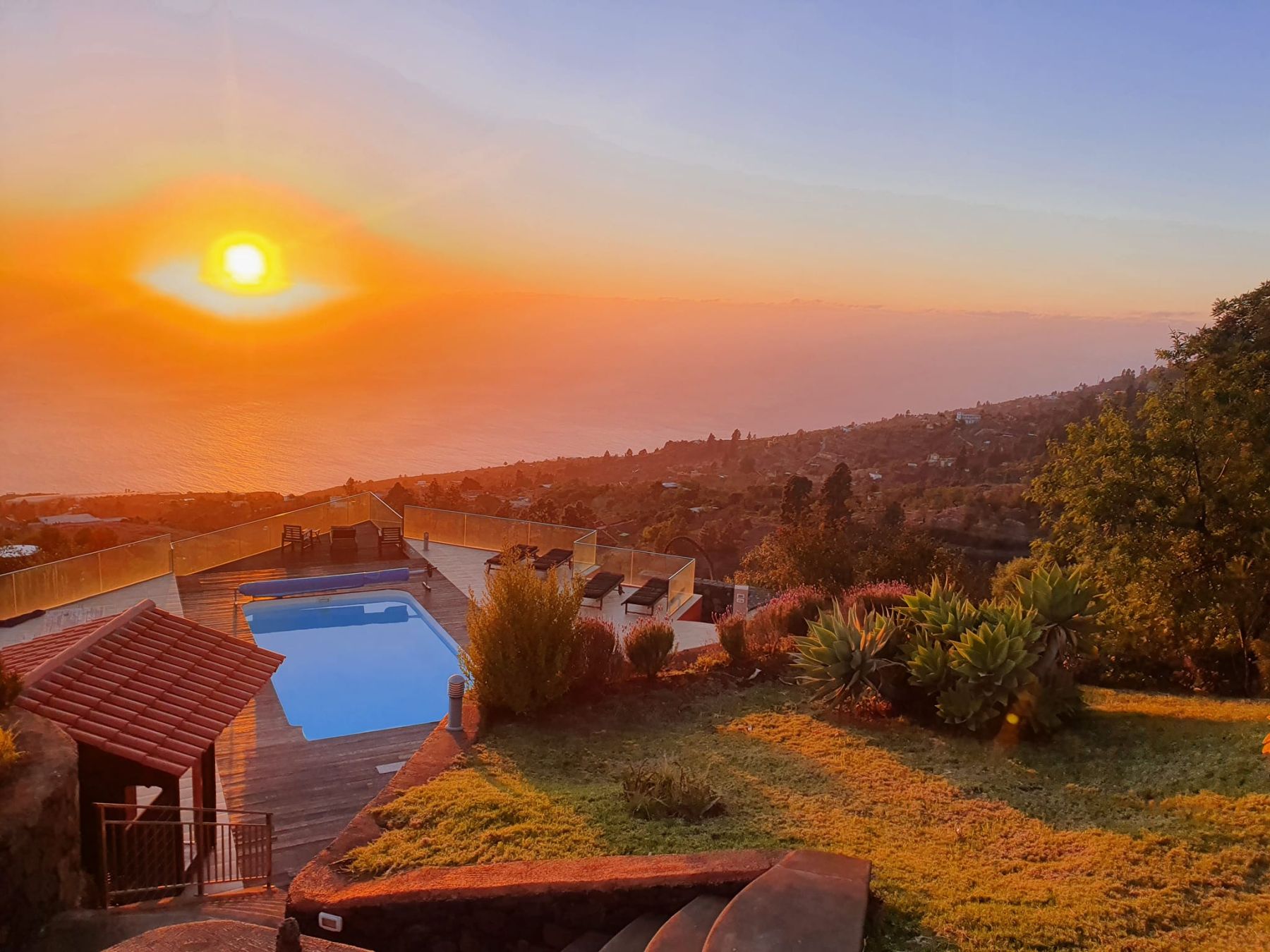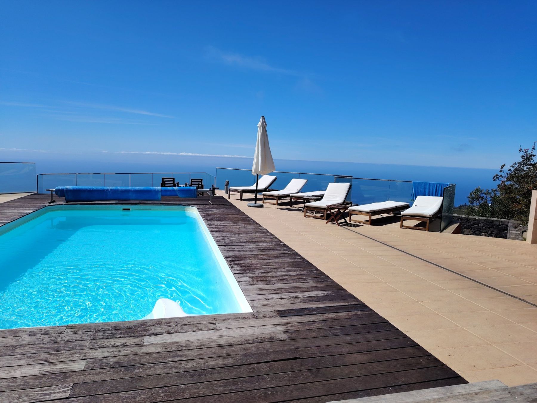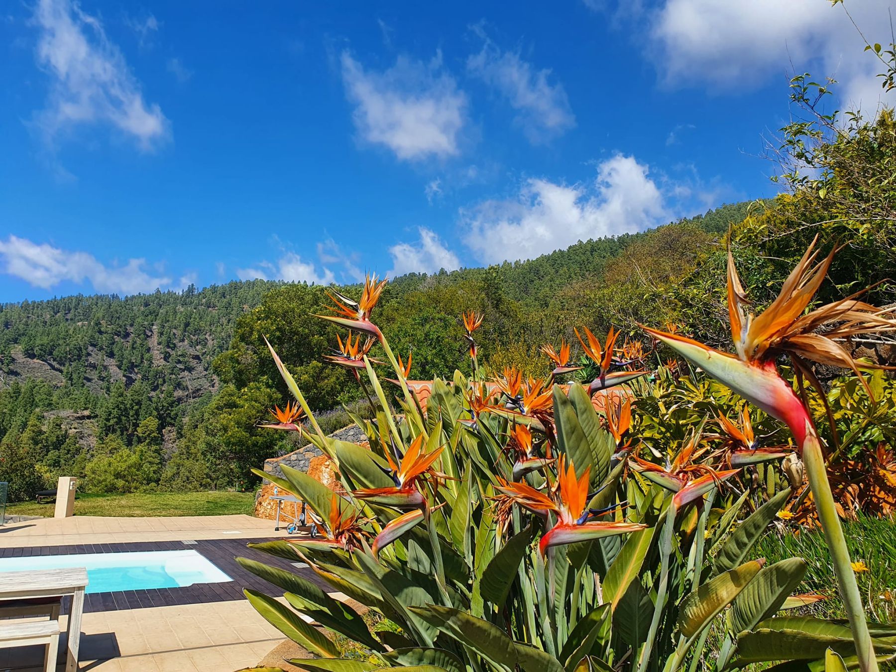 The hillside villa is nestled near Tijarafe village on a five-acre site on a mountain ridge at an altitude of 700 meters. It is surrounded by pine and almond trees as well as some fruit trees (apple, fig, orange, lemon, nispero, avocado, kaki, plum, chestnut, chirimoya, etc.). Various terraces will serve as meeting, dining and lounging areas. The main terrace has an 8m x 4m heated swimming pool, two person jacuzzi, a wooden outdoor sauna house, a ping pong table and sun-beds.